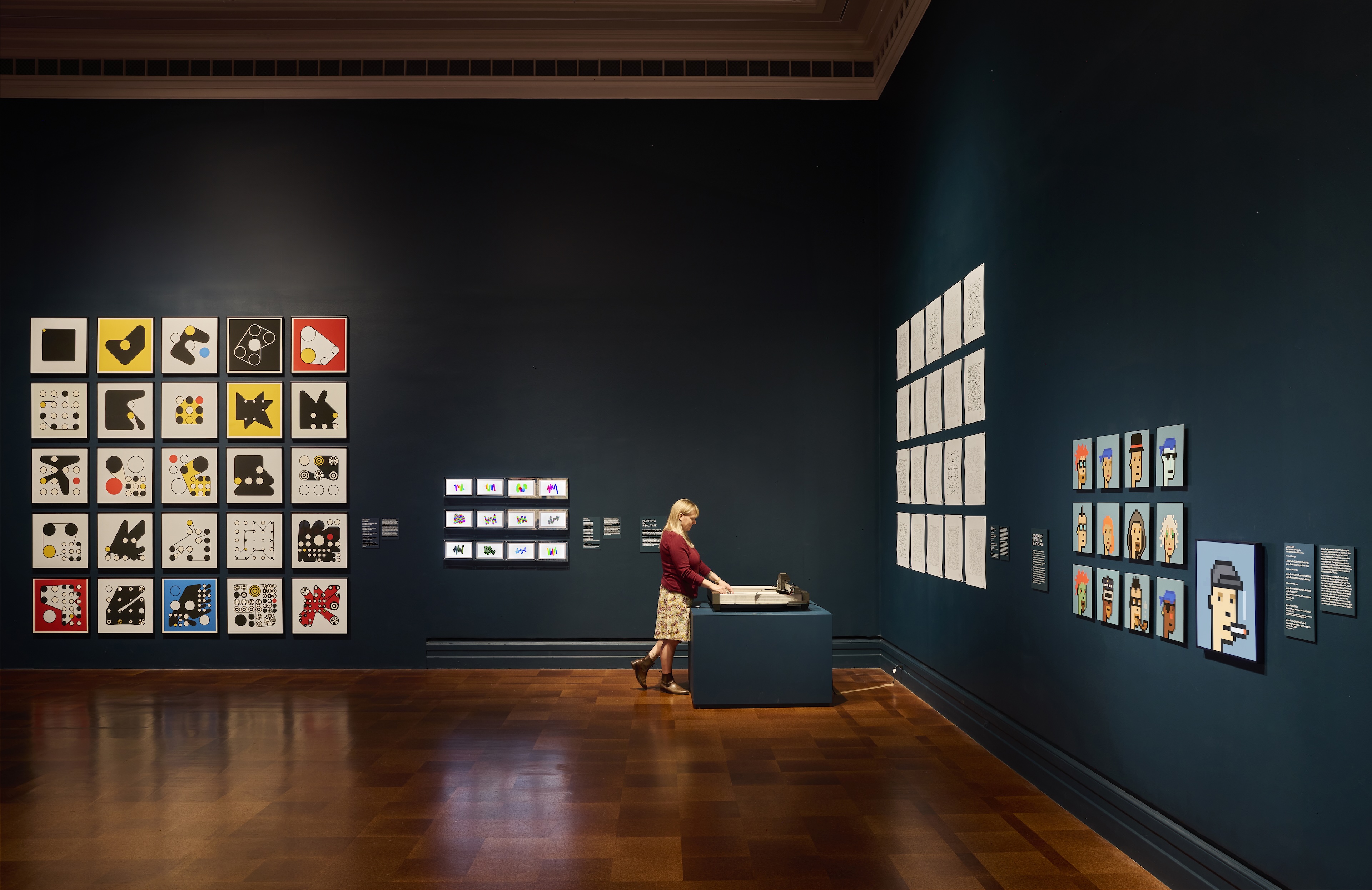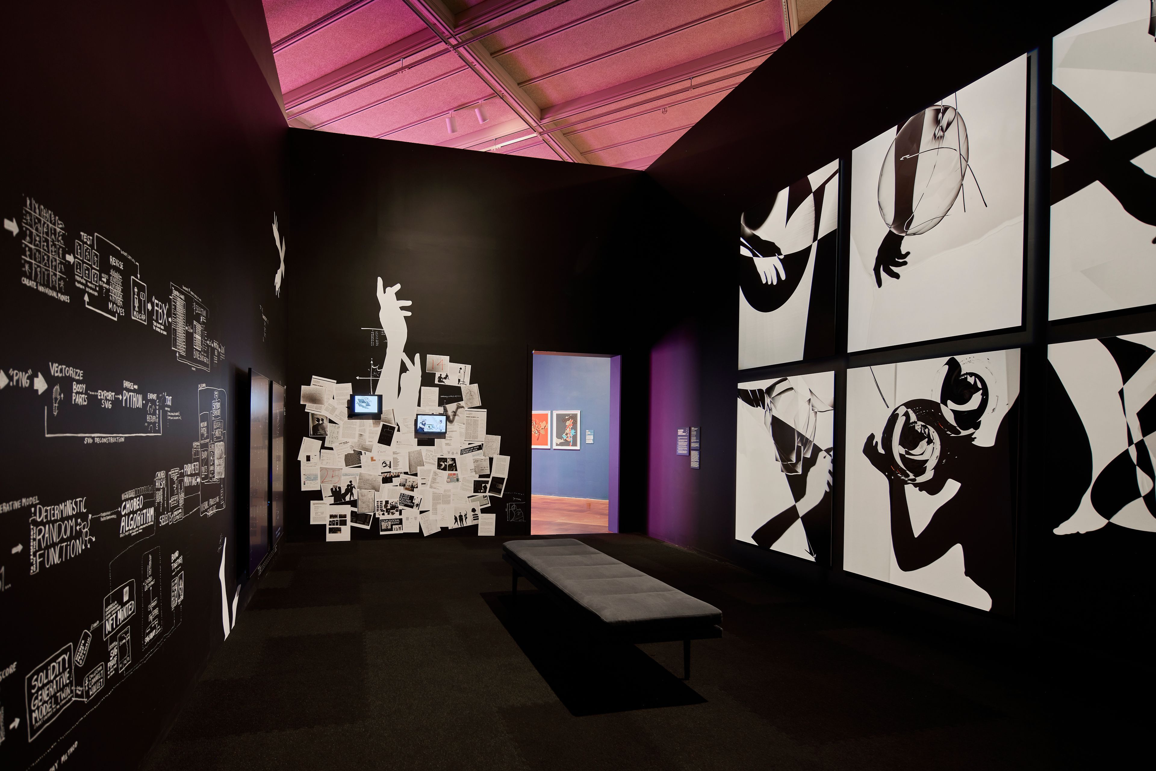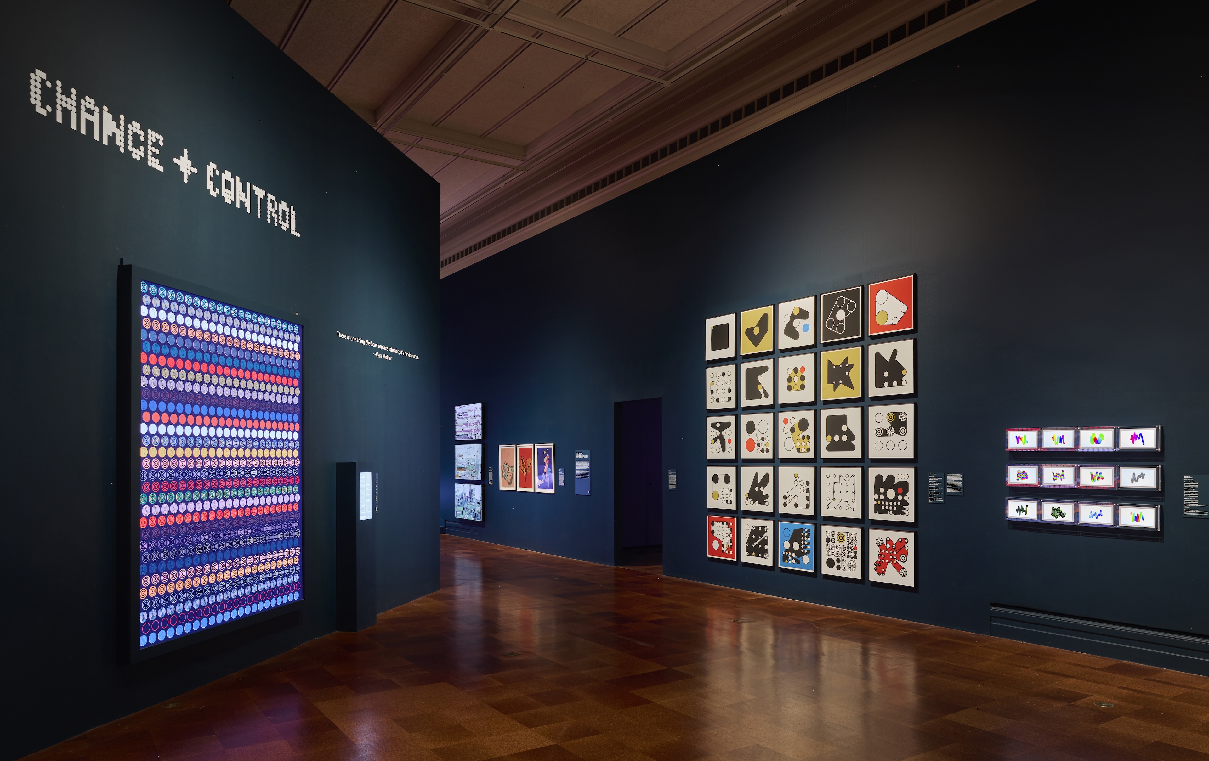 Spanning from early experiments in computer art to contemporary algorithmic aesthetics, the show highlights the evolution of image-making in the digital age. The show includes printed works by pioneers of rule-based art such as Sol LeWitt and Vera Molnár, generative and digital works by artists like Dmitri Cherniak and Emily Xie, and interactive, screen-based installations by Casey Reas and Tyler Hobbs. The design concept considers the gallery spaces as a “space of computation” that seamlessly integrates digital works into the exhibition flow and every display and interaction technology is carefully considered and designed. In addition to the spatial and digital design we developed a computational visual identity, signage and website design, as well as a bold entrance experience.